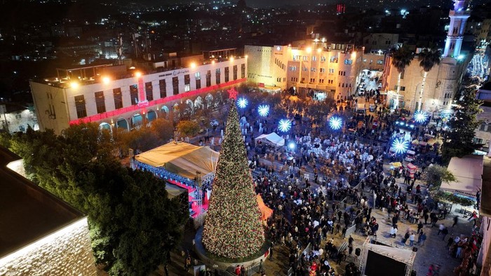Betlehem – Betlehem kembali bersinar dengan penyalaan pohon Natal raksasa di Alun-alun Palungan setelah dua tahun perayaan yang muram. Warga menyambut sukacita.