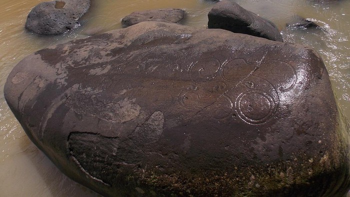 Di permukaannya terdapat pahatan bergaya piktograf berbentuk ikal atau garis-garis melingkar yang saling terhubung. Sayangnya, sebagian bentuk ukiran tersebut mulai memudar akibat usia dan kondisi lingkungan.