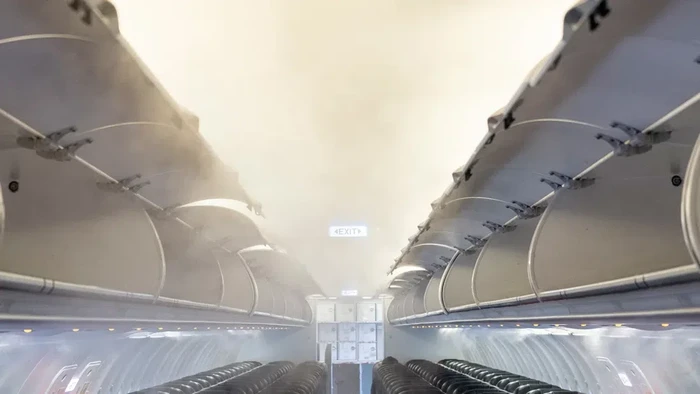 Seorang penumpang wanita meringis kesakitan selama penerbangan karena matanya terluka. Dia kejatuhan benda dari kompartemen kabin pesawat.