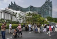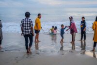 Jakarta – Pantai Marunda, Jakarta Utara, ramai pengunjung saat libur sekolah dan Nataru. Warga menikmati liburan sederhana dengan berenang hingga makan bersama.