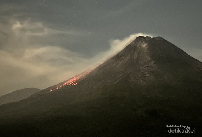 Dari kejauhan, lava pijar Merapi terlihat seperti goresan cahaya merah yang mengalir perlahan di lereng gunung. Pemandangan ini begitu kontras dengan langit malam yang gelap dan bintang-bintang yang bertebaran.