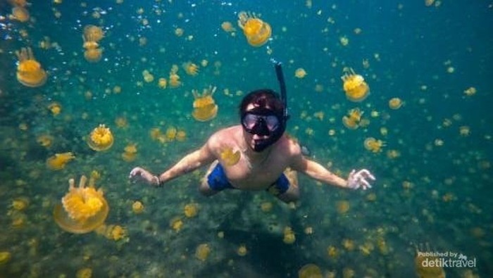 Ubur-ubur di sini tidak dapat terlihat jika dilihat dari atas permukaan air. Namun, jika Anda memasukkan kepala di bawah air, Anda akan melihat ubur-ubur berwarna kuning yang cantik dan menggemaskan.